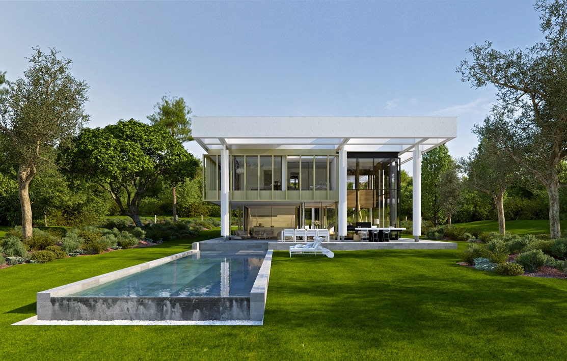 La fachada de vidrio de la casa garantiza una total transparencia entre el interior y el exterior, transportando la naturaleza de los lagos de alrededor, y el verdor de los campos de golf, dentro de la casa.